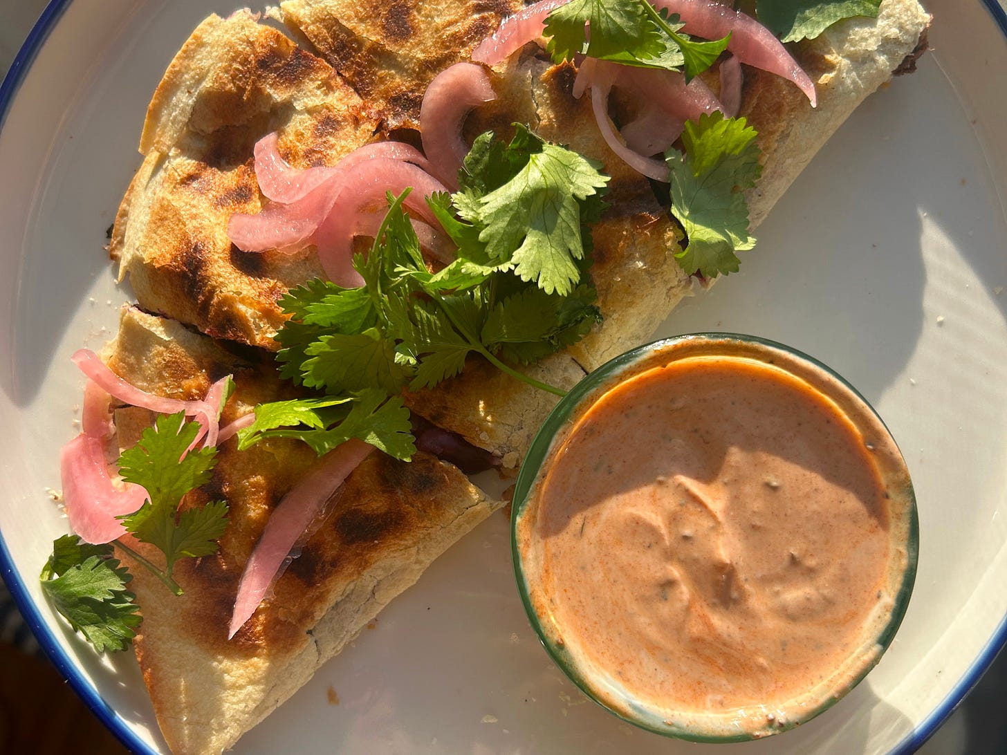 Mashed Bean Quesadilla with Chipotle Mayo & Pickled Onions